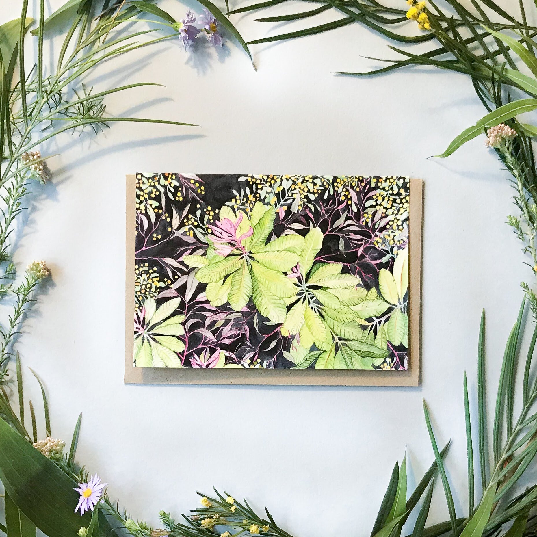 Ingrid’s greeting cards are prints of her original watercolours. They are blank on the inside, made with recycled paper, printed in Australia, and hand folded in the company of cockatoos.